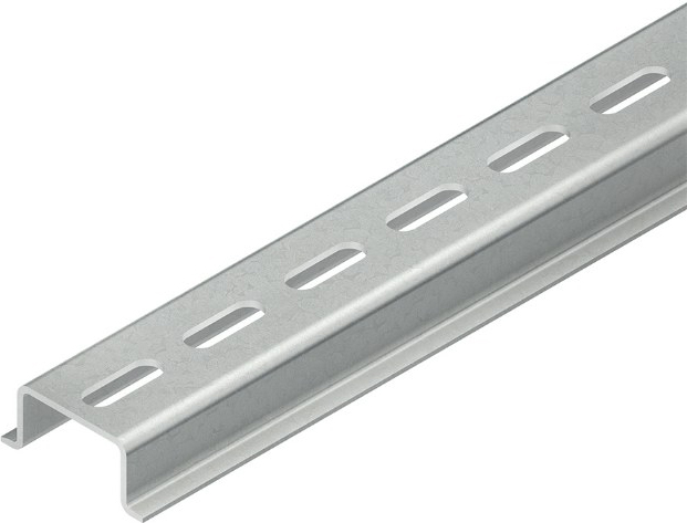 Niedax Tragschiene Modell 2934, Tragschiene TS 35 Anschlußmaße entsprechen DIN EN 60715, höhere und stärkere Ausführung, gelocht, bandverzinkt nach DIN EN 10346, zur Schnellbefestigung von Installationsgeräten und Reihenklemmen. Abmessungen (ca. Maße) H x t : 15 x 1,5 mm Befestigungsmaß B : 27 mm TS Aufrastmaß B1 : 35 mm Lochung : 5,2 x 18 mm Abstand d. Lochung : 25 mm Lieferlänge L : 2000 mm