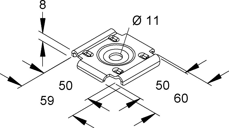 Wand- u. Bodenbefestigungsplatte, zur Wandbefestigung für Gitterrinnen mit einer Breite = 100 mm und mindestens zwei seitlichen Längsdrähten mit einem mittigen Abstand von 50 mm, zur Boden- und Deckenbefestigung für Gitterrinnen mit mindestens zwei Bodenlängsdrähten mit einem mittigen Abstand von 50 mm. Verwendung für Wandbefestigung : MTC 105.100 MTS 105.100 MTCG 50.100 Verwendung für Bodenbefestigung : alle Niedax Gitterrinnen, MTC... .100 - ... und MTS... .100 - ..., mit Ausnahme von GR 40.040, GRC 60.060 und GRCI 50.050 - ... .300 Verwendung für Deckenbefestigung : MTCG 50.100 Abmessungen (ca. Maße) B x L x H : 59 x 60 x 8 mm Befestigungslochung : Ø 11 mm für Drahtabstand : 50 mm Werkstoff : Stahl, bandverzinkt nach DIN EN 10346