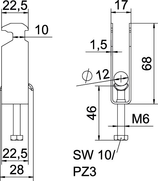 Bügelschelle mit Hammerkopf-Fuß, Metalldruckwanne mit gerundeten Kanten für Kabelschutz. Zur vertikalen und horizontalen Montage von 3 Einzelkabeln an C-Profilschiene. Für Schlitzweite 16 - 17 mm. Mit 1-gängiger Schraube an Druckwanne, universeller Sechskant-Schraubenkopf SW10, mit Schlitz und Kreuzschlitz. Geeignet für Montage im Innen- und Außenbereich. Mehrere Kabel sollten durch Doppelwannen getrennt werden. Der Einsatz einer Gegenwanne wird empfohlen.