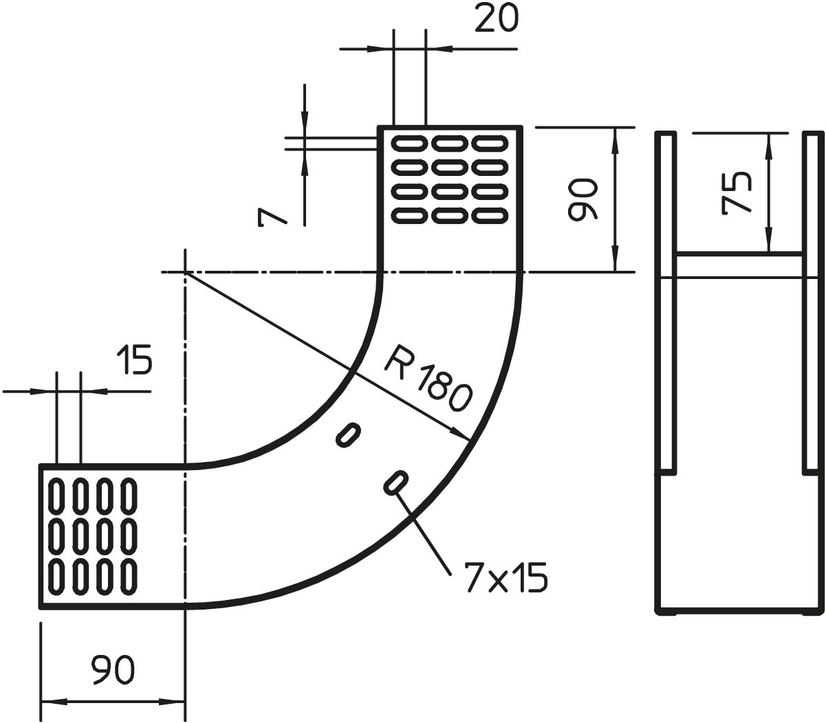 Vertikalbogen 90° in steigender Ausführung für alle Kabelrinnentypen mit der Seitenhöhe 85 mm.