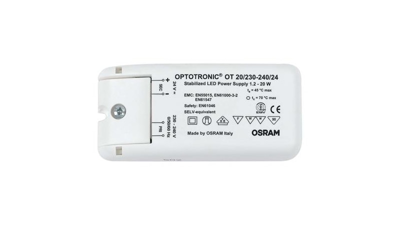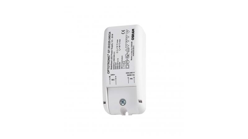 The 24 V constant voltage LED driver OT 20/200 ... 240/24 E from OSRAM is suitable for SELV indoor and outdoor installations. As an outdoor application, it can only be used in suitable luminaires. It is also ideal for the use in tight, flat luminaires or in suspended ceilings.