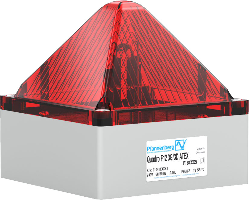 13J Blitzleuchte in sehr widerstandsfähigem Gehäuse mit roter Haube - Zertifiziert für den Einsatz in explosionsgefährdeter Umgebung der Zone 2 gemäß EN 60079-10 und Zone 22 gemäß EN 61241-10 - die Anforderungen der Normen EN 60079-0, EN 60079-15, EN 61241-0, EN 61241-0 (2007) und EN 61241-1 (2005) werden erfüllt. Einsetzbar für Gase der Temperaturklassen T1, T2, T3 und T4 sowie für nichtleitende Stäube unter Berücksichtigung, dass die Oberflächentemperatur des Betriebsmittels + 105 C nicht übersteigt - Montage erfolgt über verdeckte Innenbohrungen oder über Außenlaschen, schnell, flexibel und sicher - herausragende mechanische Festigkeit mit IP66, IP67 und IK08 - ob im freien Gelände, bei Hagelschlag und Hochdruck-Reinigungsanlagen, die Quadro bleibt dicht und signalisiert sicher - Gehäuse und Haube sind aus schlagfestem Polycarbonat gefertigt - Lebensdauer: nach 12 Mio. Blitzen noch 70% Lichtemission - Maße: LxBxH 130 x 130 x 130mm - Betriebstemperatur: -20C - +45C - Maximale Sichtweite: 229m - 7 Haubenfarben: klar, weiß, gelb, orange, rot, grün, blau - Einschaltstrom ist zur Schonung des Anschaltrelais begrenzt auf <7A / 0,15mS (230V AC), <5A / 2ms (24V DC)