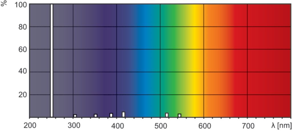 - Short-wave UV radiation with a peak at 253.7 nm (UVC) for disinfection purposes