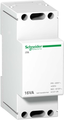 Klingeltransformator Acti 9 iTR. Ausgang 8-12V AC aus 230V Niederspannungsnetz, Leistung 16VA. Mit Klingel- und Sicherheitstransformatoren können Kleinspannungen aus einem Niederspannungsnetz entnommen werden. Kurzschlussfest. Schutzklasse II mit Klemmenabdeckung (optional). Der Klingeltransformator iTR erfüllt folgende Normen- EN 61558-2-6 und EN 60742.