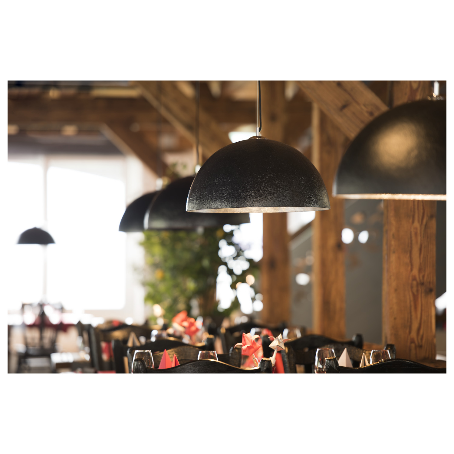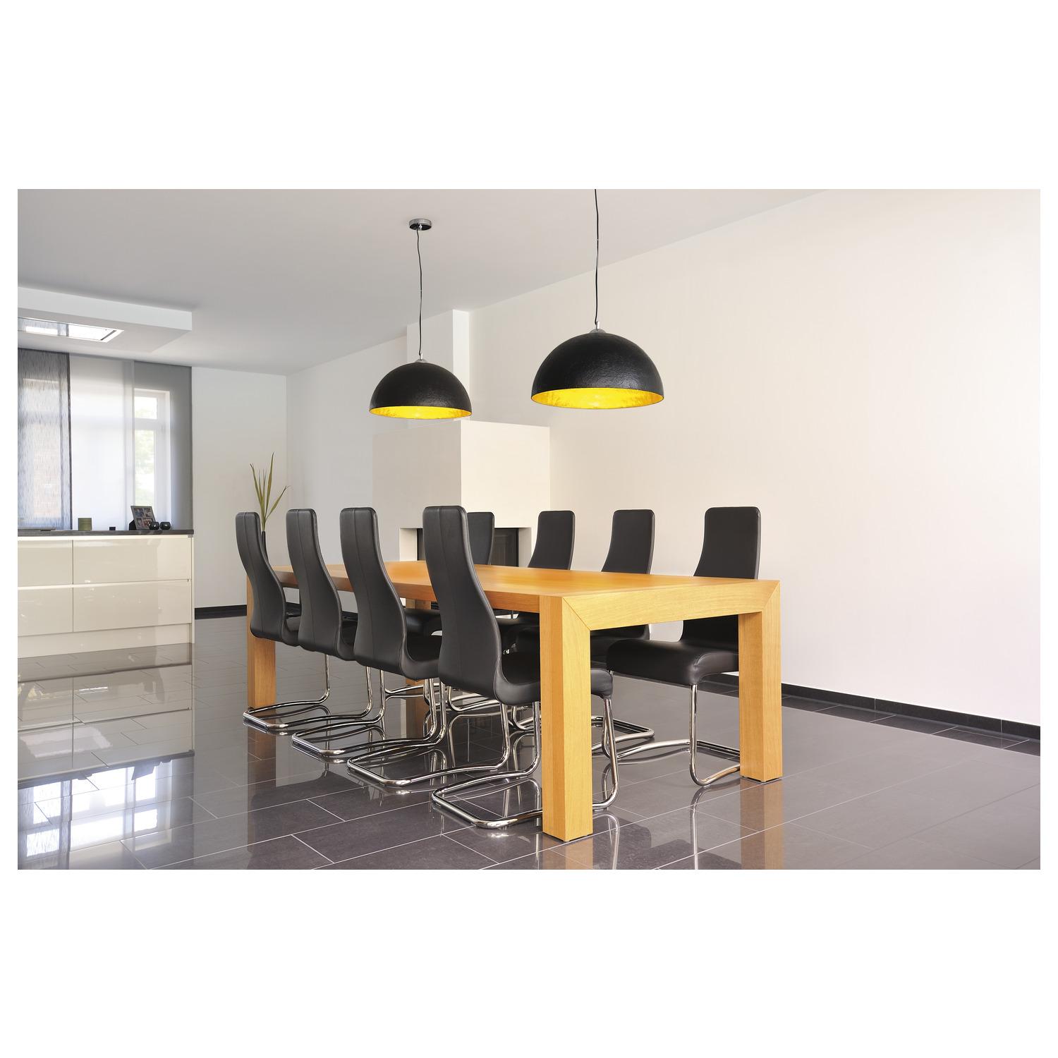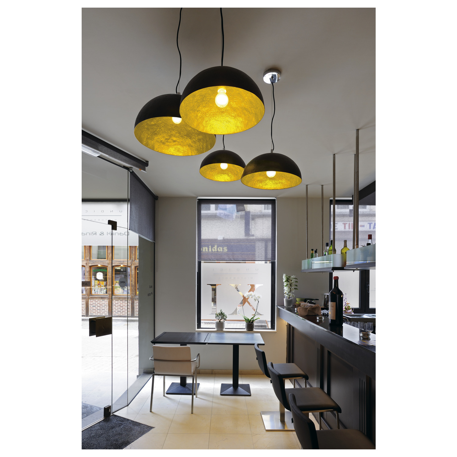 Die FORCHINI PD-1 Pendelleuchte ist die größere Version dieser Serie und verfügt über einen Leuchtenschirm aus Glasfaserkunststoff, der über ein Textilkabel mit der verchromten Deckenrosette verbunden ist. Wahlweise verfügbar mit schwarz matter oder weiß matter Außen Lackierung haben Sie jeweils die freie Wahl der Innenlackierung in silberner oder goldener Ausführung. Neben optischen Aspekten hat die reflektierende, innere Oberfläche auch Auswirkungen auf die Lichtfarbe. Die FORCHINI PD-1 wird fertig für den Anschluss an 230V Netzspannung geliefert.