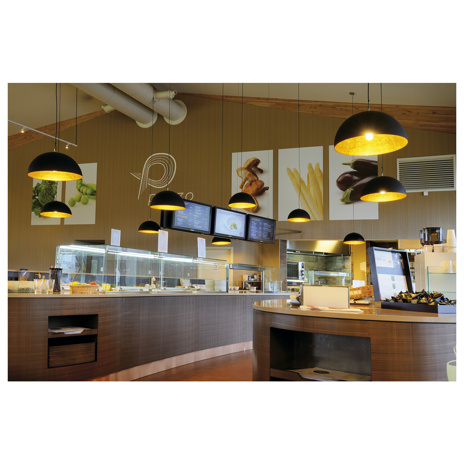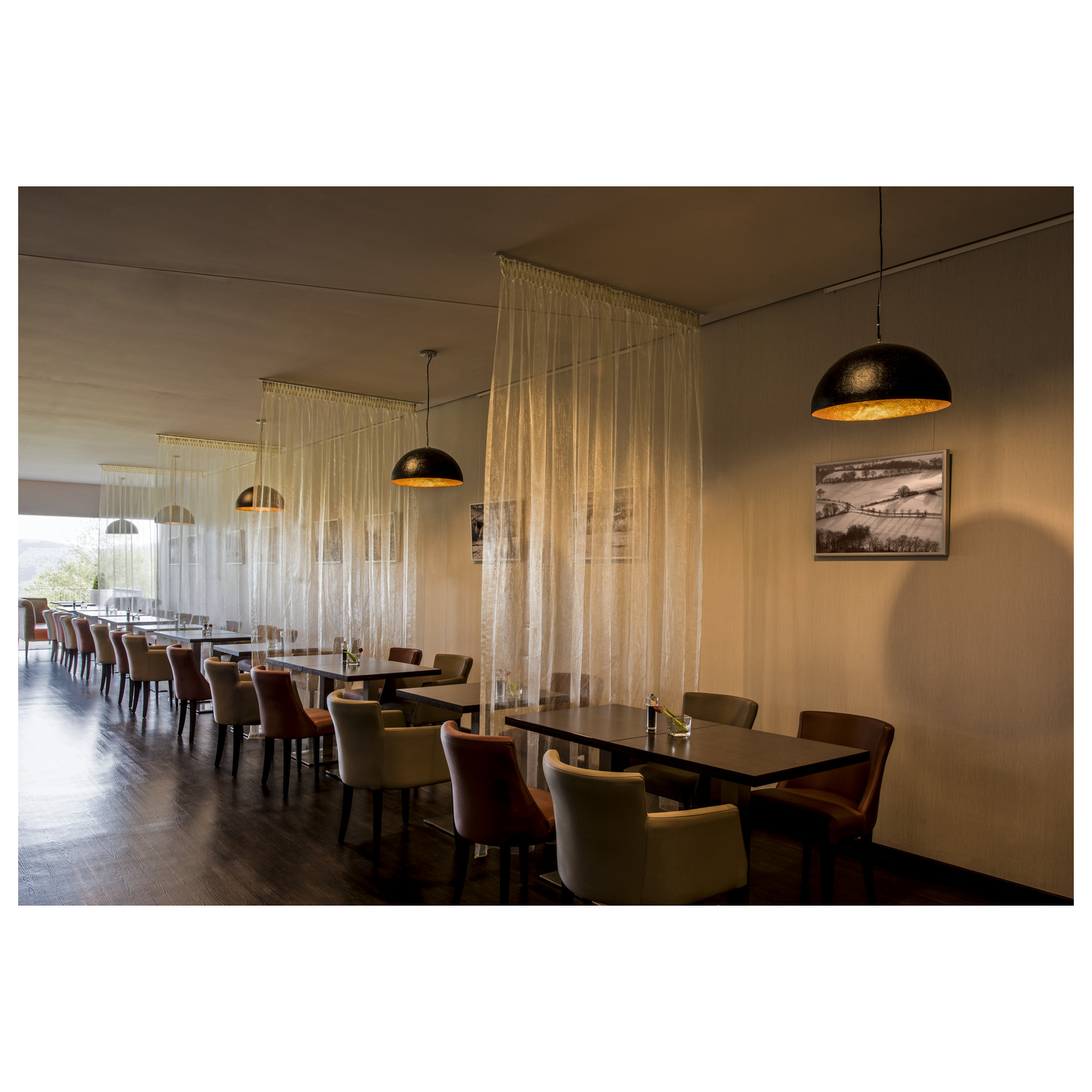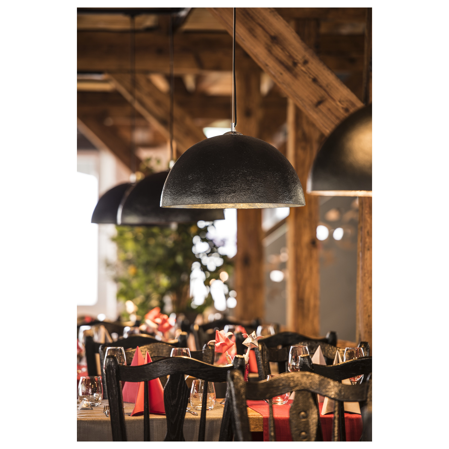 Die FORCHINI PD-1 Pendelleuchte ist die größere Version dieser Serie und verfügt über einen Leuchtenschirm aus Glasfaserkunststoff, der über ein Textilkabel mit der verchromten Deckenrosette verbunden ist. Wahlweise verfügbar mit schwarz matter oder weiß matter Außen Lackierung haben Sie jeweils die freie Wahl der Innenlackierung in silberner oder goldener Ausführung. Neben optischen Aspekten hat die reflektierende, innere Oberfläche auch Auswirkungen auf die Lichtfarbe. Die FORCHINI PD-1 wird fertig für den Anschluss an 230V Netzspannung geliefert.