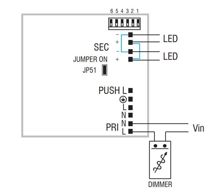 Dimming is possible via a Phase Cut or PushDIM interface in a range of 0.5% to 100%.