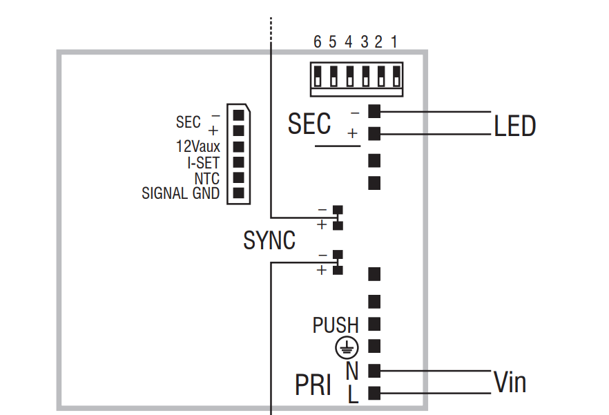 The driver has a 12 V auxiliary output for a maximum of 50 mA and an analogical input for a thermal sensor. The input and output terminal blocks are on the same side (wire cross-section up to 1.5 - 2.5 mm2 / AWG15 - AWG13). Clamping screws for cables with a diameter of min. 3 mm – max. 8 mm are mounted on primary and secondary circuits.