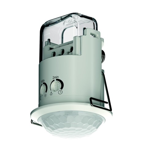 Bewegungsmelder (PIR) für die DE-Deckenmontage im Innenbereich, Runder Erfassungsbereich 360°, Quer gehend 6 m, Sitzend 2 m bei 2, 5 m Montagehöhe, 1 Kanal Licht (Relais 230 V), Automatische bewegungs- und helligkeitsabhängige Steuerung für Beleuchtung, Mischlichtmessung, Betrieb als Vollautomat, Helligkeitsschaltwert per Potentiometer einstellbar, Nachlaufzeit per Potentiometer einstellbar, Durch werkseitige Voreinstellung sofort betriebsbereit (Helligkeits-Schaltwert 100 Lux, Nachlaufzeit 2 min.)