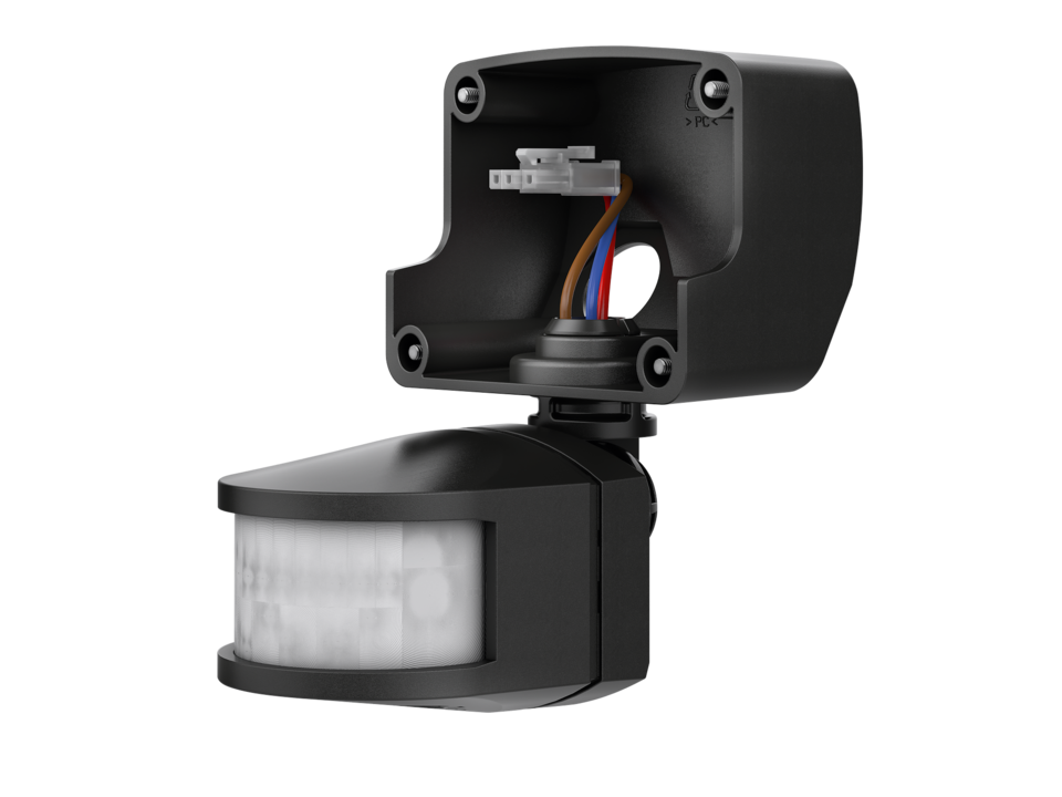 Bewegungsmeldermodul, schwarz, Erfassungswinkel 180° bei 12 m Reichweite, zusätzlicher Schaltausgang Licht, Sensor um ± 90° horizontal und 90° nach unten/hinten drehbar