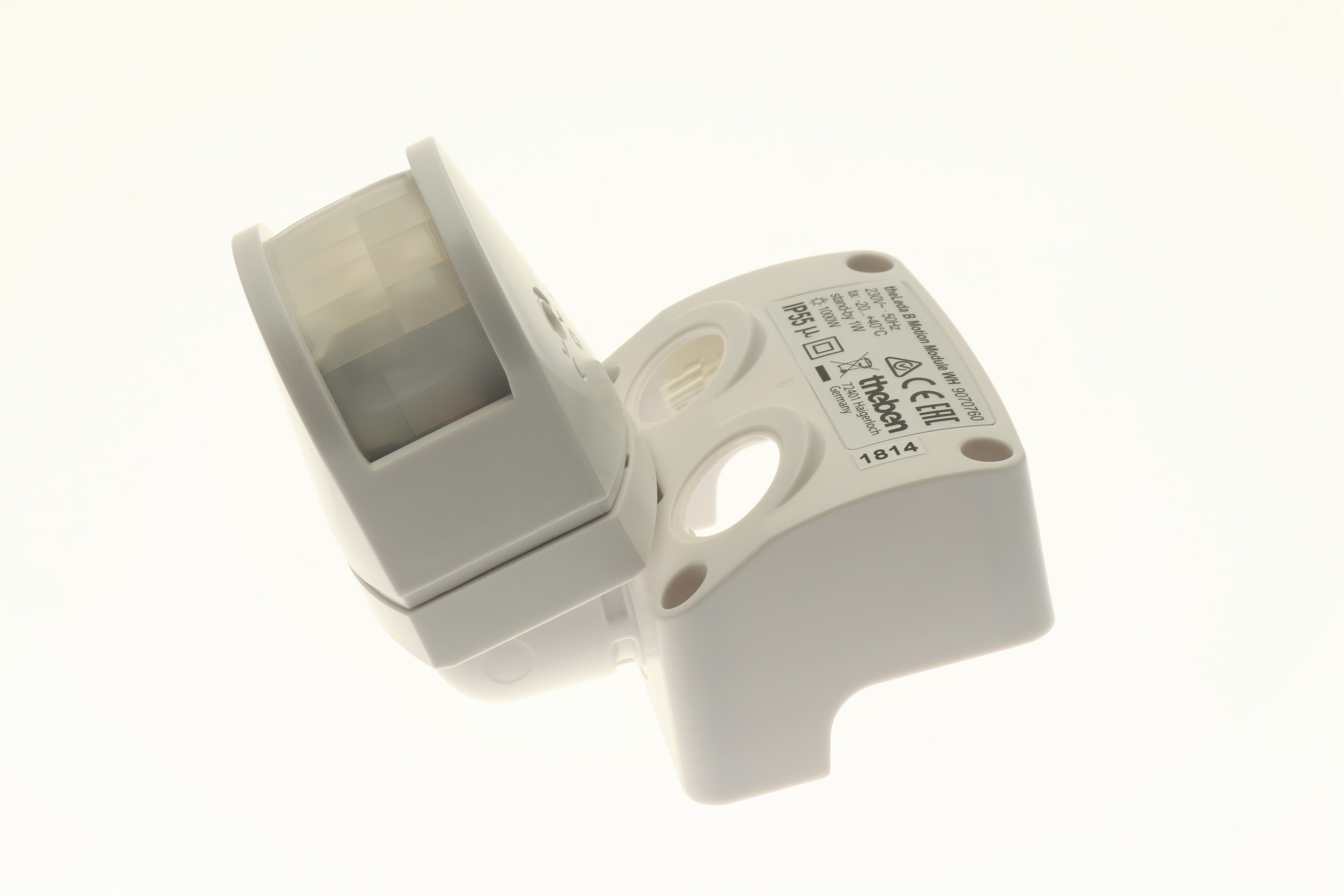 Bewegungsmeldermodul, weiß, Erfassungswinkel 180° bei 12 m Reichweite, zusätzlicher Schaltausgang Licht, Sensor um ± 90° horizontal und 90° nach unten/hinten drehbar