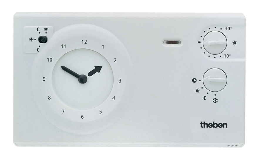 Elektronischer Raumtemperaturregler umschaltbar für 24 Std. oder 7 Tage Programm, automatische Nachtabsenkung programmierbar alle 5 Min. bzw. 30 Min., kürzeste Schaltzeit für Wochenprogramm 2 Std., Tag-und Nachttemperatur einstellbar von +10°C ... 30°C, Betriebsartenwahlschalter, Frostschutz 6°C, Partyschalter, Kontrollanzeige, thermische Rückführung und Arbeitspunkt einstellbar, Gehäusefarbe weiß, 1 Wechsler