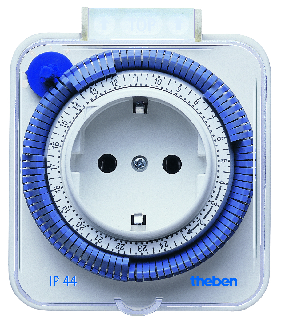 Kompakter Zeitprogrammstecker, mit Spritzwasserschutz (IP 54), Tageszeitprogramm durch 96 Segmente im Abstand von 15 Min. programmierbar, Handschalter für Schaltungsvorwahl
