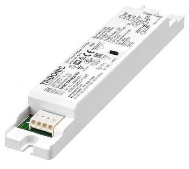 The Tridonic emergency lighting LED driver is compatible with all dimmable and non-dimmable constant current LED drivers. Its 3-pole technology initiates a 2-pole LED module changeover and delayed power switching for the LED driver. If the LED load is outside the allowable range, the output automatically shuts off.