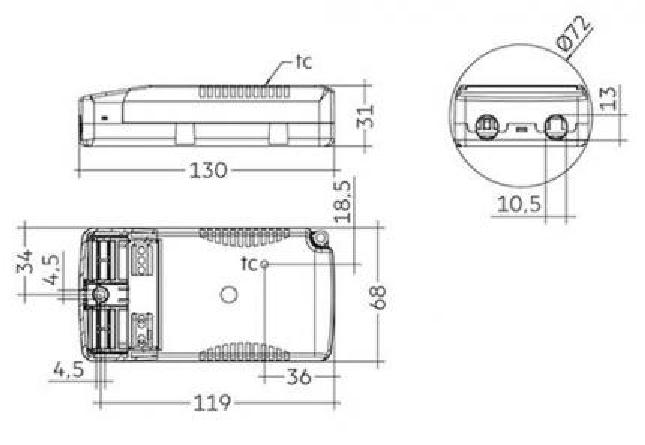 The LED driver can be dimmed by means of phase and phase dimming dimmers in a dimming range of 5 - 100% (depending on the dimmer).