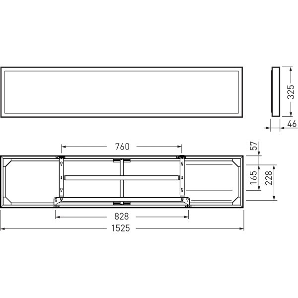 Luminaire body of aluminium. Surface coated white (RAL 9016). Dimensions (L x W): 1525 mm x 325 mm, luminaire height 46 mm. Safety class (EN 61140): II, protection rating (DIN EN 60529): IP20, impact resistance level in accordance with IEC 62262: IK02, testing temperature of wire glow test in accordance with IEC 60695-2-11: 650 °C. Weight: 4,2 kg.