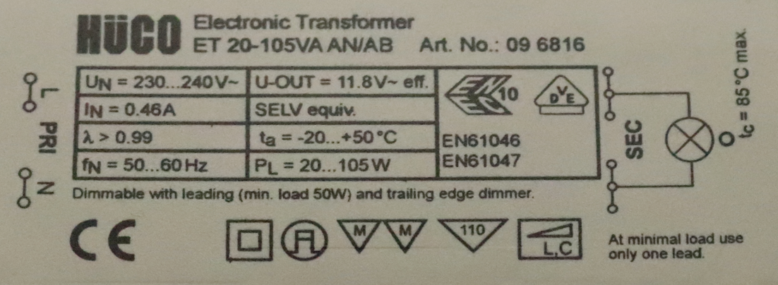 Elektronischer Transformator für Niedervolt-Halogenlampen 20-105VA, Bauform 160x40x30mm