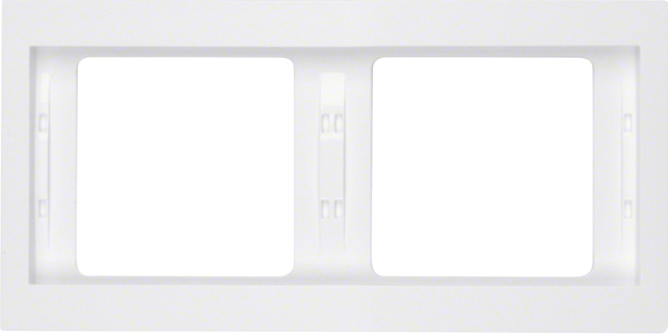 Rahmen 2fach waagerecht, K.1, polarweiß glänzend. Abdeckrahmen für waagerechte Montage. Für Verwendung von polarweißen Zentralstücken. Unterputz-Installation, Flächenprogramm, 2-fach. Material: Kunststoff, Thermoplast, bruchsicher, hochglänzende Oberfläche, halogenfrei.