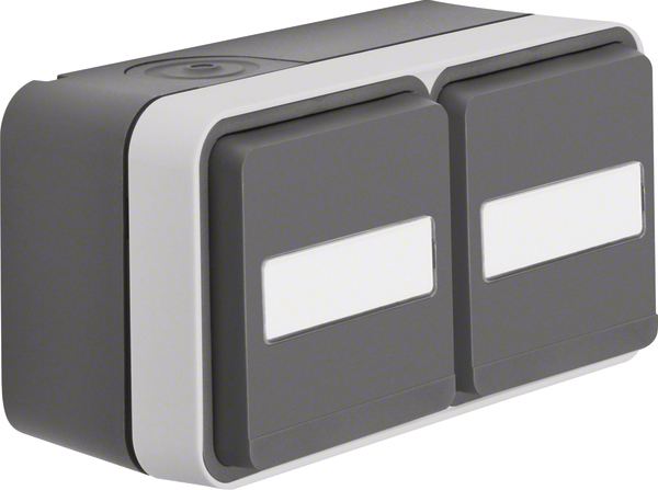 Steckdose Schutzkontakt 2f. waag. mit Klappdeckel, mit Beschriftungsfeld W.1, grau. Steckdose Schutzkontakt® 2-fach waagerecht mit Klappdeckel AP - Beschriftungsfeld, IP55, Beschriftungsfeld ca. 50 x 16 mm, Beschriftungsfeldhöhe für P-touch Band 12 mm ausgelegt. Für waagerechte Montage, Einsätze durchverdrahtet, mit Steckklemmen, mit einer Einführung für 2 Leitungen und einer Einführung für Leitung oder Rohr, die obere und untere Einführung für Leitungen sind seitlich angeordnet und daher besonders geeignet für die Montage neben Türrahmen o. ä. vollflächige Dichtung unter dem Gehäuseboden zur Abdichtung der Gehäuserückseite, mit zufallendem Klappdeckel, manuell einrastbar, um den Schutzgrad IP55 zu erreichen, gut zugängliche, trichterförmige Montagelöcher in den Gehäusen, eine Wago 2-Leiter Verbindungsklemme für Verdrahtung beiliegend, zwei Einrastplätze für Wago 2-Leiter Verbindungsklemmen im Gehäuseboden, viel Platz zur Verdrahtung unter den Sockeln der Einsätze (Hohlboden), einfache Montage des Einsatzes im Gehäuse durch Einrasten, sichere Fixierung des Rahmens am Gehäuse über Bajonett-Schnellverschluss, Verbindungsklemmen nach VDE 0620, Bauart DIN 49440. Gehäuseschrauben und Klappdeckelfedern aus Edelstahl Rostfrei. Aufputz-Installation. Material: Kunststoff, Thermoplast, schlagfest.