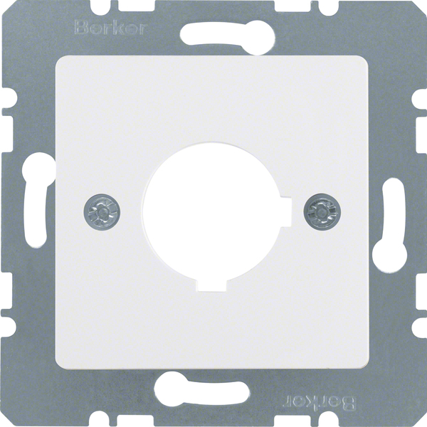 Zentralplatte für Melde- und Befehlsgerät Ø 22,5 mm polarweiß, glänzend. Zentralplatte für Melde- und Befehlsgerät mit Tragplatte, mit Ausschnitt, nur für Schraubbefestigung über Tragplatte. Geeignet für Potentialausgleich-Einbaubuchse, Rundsteckverbinder und Kleinspannungsbuchse. Hinweis: Nur mit Zwischenring des Schalterprogramms zu verwenden. Beschriftungsfeld einrastbar in passenden Zwischenring.