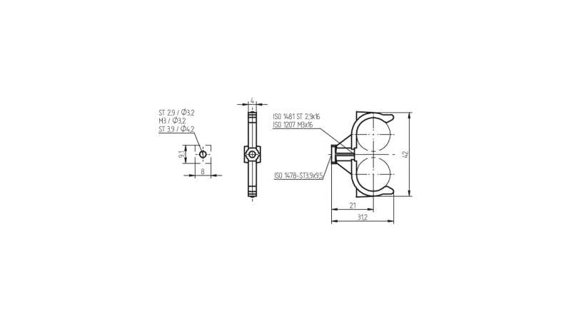 Schraubbefestigung von oben: für selbstschneidende Schrauben ISO 1481 -ST 2,9 x 16 oder Schrauben ISO 1207 M3 x 16 Schraubbefestigung von unten: für selbstschneidende Schrauben mit Gewinde ISO 1478 ST 3,9 x 9,5 Halter gewährleisten gleichbleibenden Abstand zwischen Lampe und Leuchtengehäuse