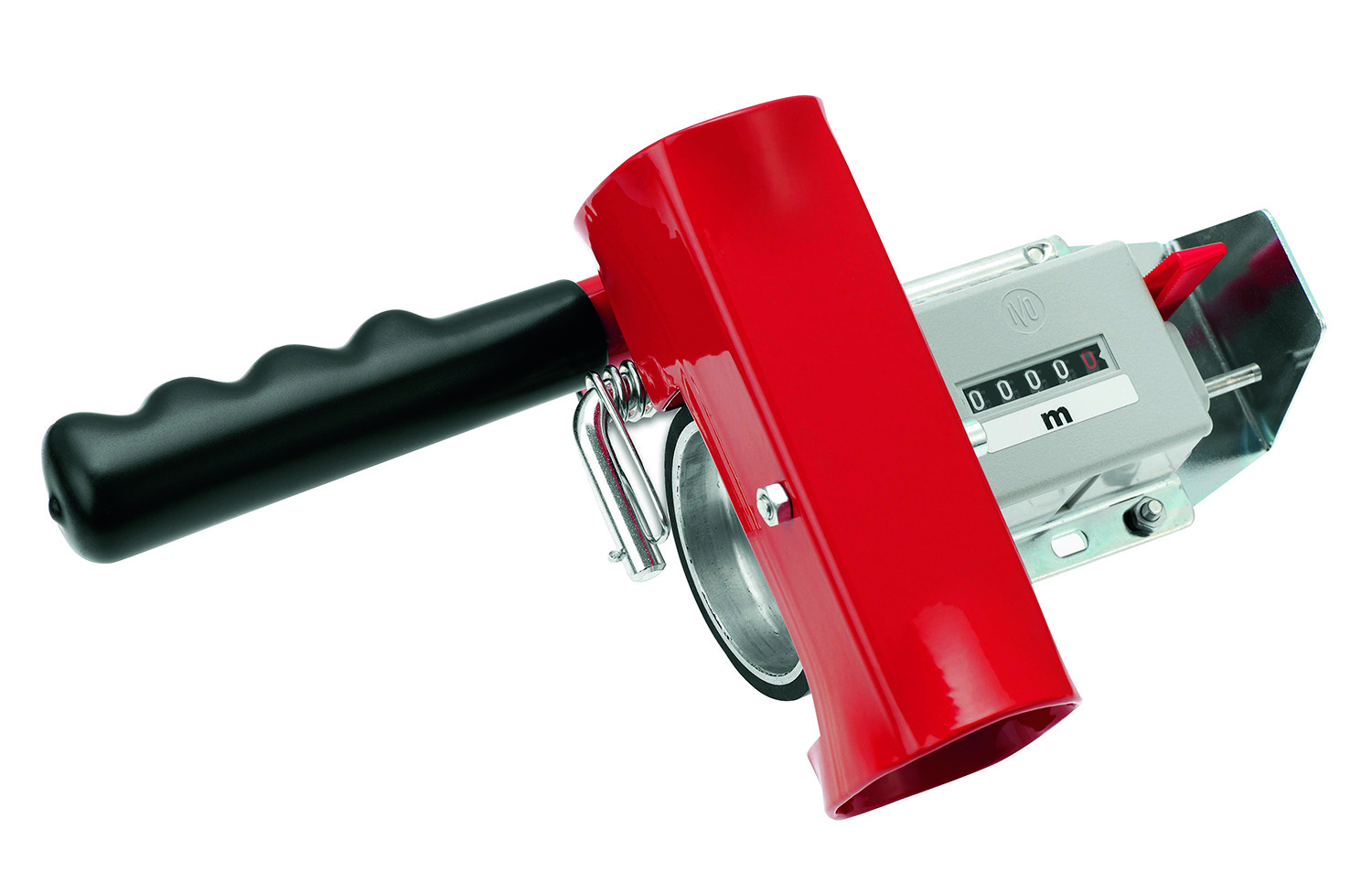 Kabellängen-Handmessgerät, Messgerät zur schnellen und genauen Bestimmung von Kabellängen, weiter Anwendungsbereich für alle Arten von Kabeln und ähnlicher Wickelgüter von einem Ø von 4-35 mm, automatische Kabelgrößen- Anpassung über Druckbügel, deutsches Markenzählwerk mit hoher Messgenauigkeit, Messbereich 0 bis 9999,9 m. Nullstellung durch Reset- Hebeltaster, gummiertes Messrad aus Aluminium, abschraubbarer Handgriff für mobilen Einsatz auf Baustellen, in Lager, Werkstatt etc., mit Aufnahmeschaft für stationären Einsatz in Verbindung mit allen CIMCO-Verbindungsgestell, auch für den Kabelring-Abspuler (CIMCO-Artikelnr.. 14 2740) montierbar. Ausführung: gummiertes Messrad aus Aluminium; mit einem Ø von 4-35 mm.
