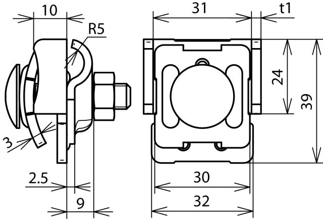 Falzklemme nach DIN EN 62561-1, zum Verbinden von Rundleitern mit Falzen. Ausführung mit Klemmbock, Leitungsführung längs oder quer.