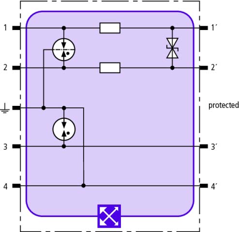 Platzsparendes Kombiableiter-Modul mit LifeCheck zum Schutz von 1 Doppelader erdpotentialfreier symmetrischer Schnittstellen, wahlweise direkte oder indirekte Schirmerdung. LifeCheck erkennt thermische oder elektrische Überlastzustände nach denen der Ableiter auszutauschen ist. Die Anzeige erfolgt berührungslos mittels DEHNrecord LC / SCM / MCM.