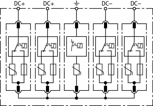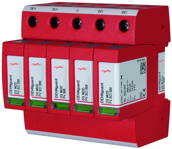 Mehrpoliger Überspannungsableiter DEHNguard M PV2 SCI, Typ 2 nach EN 61643-31 zum Schutz von 2 MPP-Eingängen. Die dreistufige DC-Schaltvorrichtung, bestehend aus Basisteil und gesteckten Schutzmodulen, mit kombinierte Abtrenn- und Kurzschließvorrichtung mit sicherer elektrischer Trennung im Schutzmodul. Zum Schutz von Niederspannungs-Verbraucheranlagen vor Überspannungen. Zum Einsatz gemäß IEC 60364-7-712:2002-05 (Errichten von Photovoltaik-Versorgungssystemen).