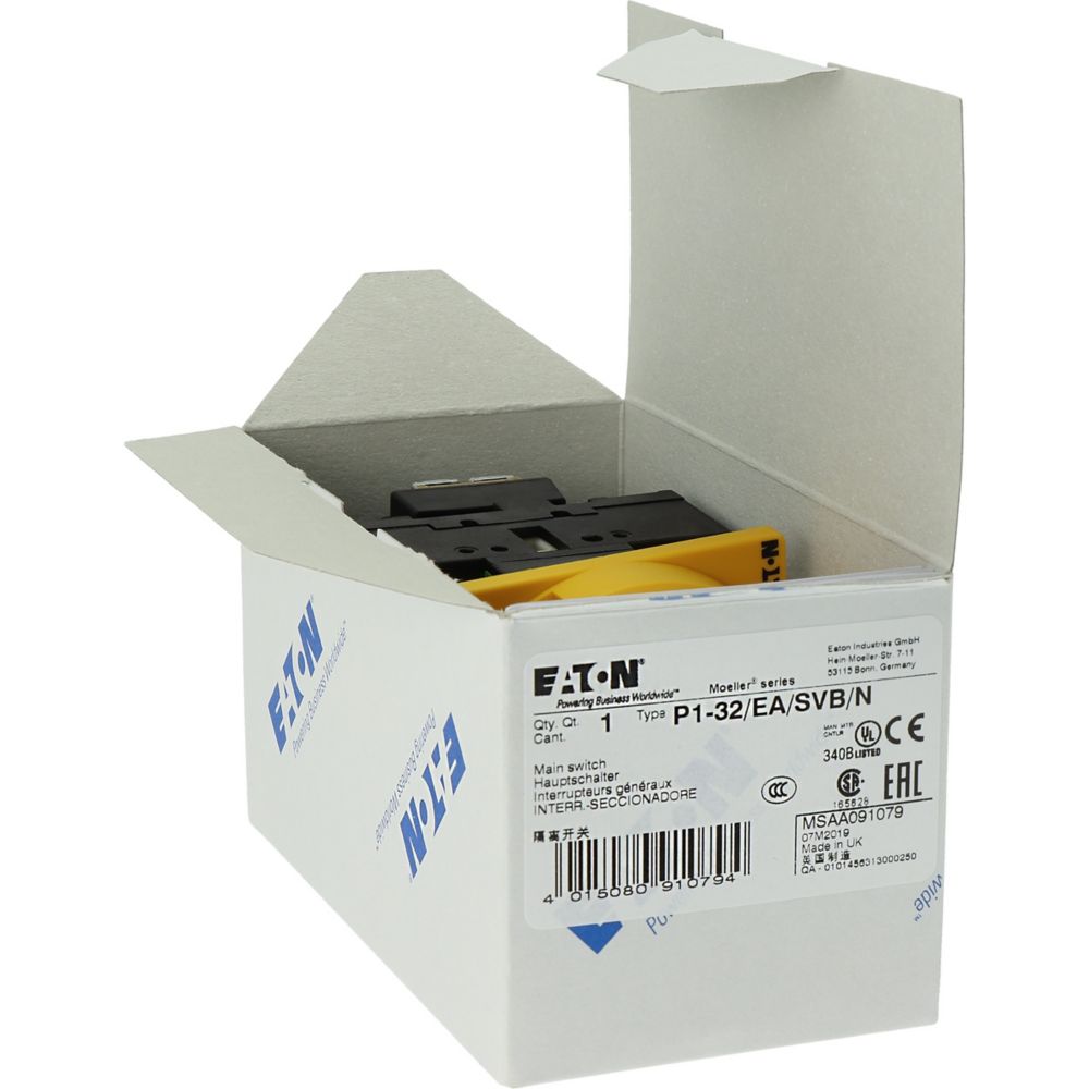 Hauptschalter, Sortiment: Hauptschalter, Wartungsschalter, Typkenner: P1, STOPP-Funktion: NOT-AUS-Funktion, mit rotem Drehgriff und gelbem Sperrkranz, Information zum Lieferumfang: Hilfsschalterkontakt nachrüstbar., 3-polig + N, Abschließbarkeit: abschließbar in 0-Stellung, Schutzart: Front IP65, Bauform: Einbau, Bemessungsbetriebsleistung AC-23A, 50 - 60 Hz 400 V: P = 15 kW, Bemessungsdauerstrom: Iu = 32 A, Normen und Bestimmungen: IEC/EN 60947, VDE 0660, IEC/EN 60204, CSA, UL, Lasttrennschalter nach IEC/EN 60947-3, NEMA12