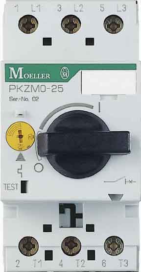 Motorschutzschalter nach IEC/EN60947, 3-polig Baugröße PKZM0, mit einstellbaren Überlast- und unverzögertem Kurzschlußauslöser, phasenausfallempfindlich, Schraub und Schnappmontage, mit Schraubklemmen, Kappeneinbaumaß 45mm, Bemessungsbetriebsspannung Ue 690V, Schutzart IP20, fingersicher nach VDE 0106 T. 100, lieferbares Zubehör: Hilfsschalter, Spannungsauslöser, Schaltantrieb, Clipsplatte