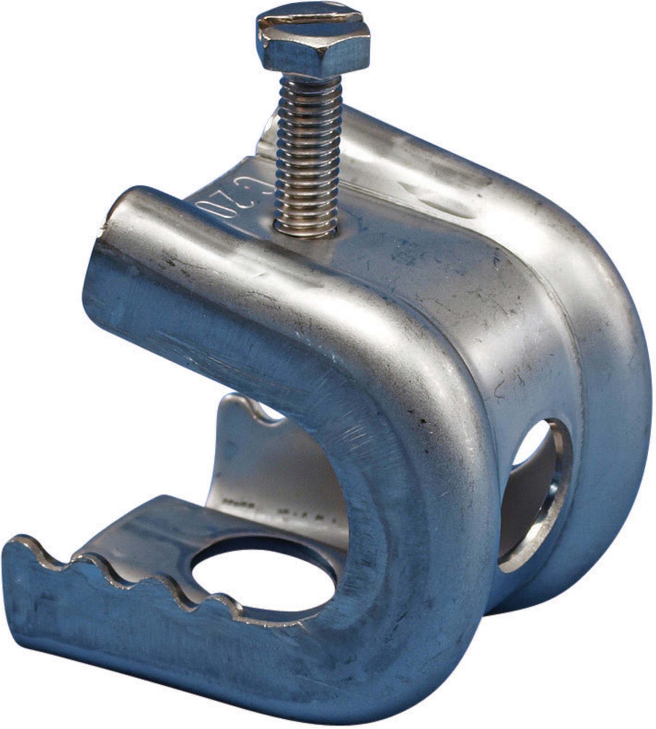 Multifunktions-C-Schelle für den Einsatz bei großen Flanschdicken. Edelstahl, für 4¿20 mm Flansche. Kombinierbar mit C-CR-Schellen für Rohre, Kabelschutzrohre oder Kabel und mit Vierkantmuttern für Gewindestangen.