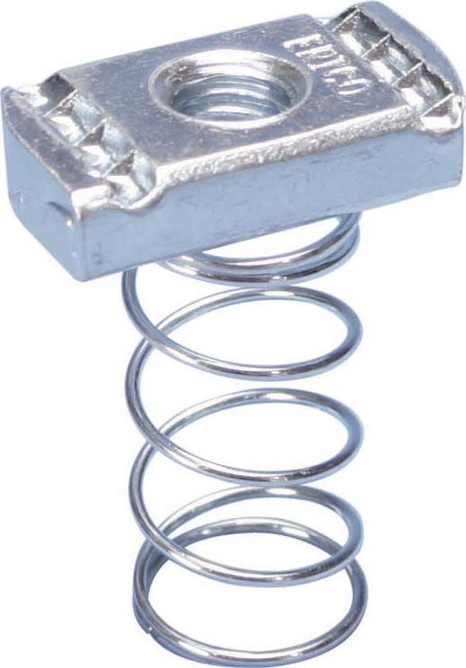 Mutter mit langer Feder, die in eine Montageschiene Typ A eingesetzt wird und Verbindungen mit Schrauben ermöglicht. Für Standardmontageschiene, feuerverzinkter Stahl, M10, 8 mm.