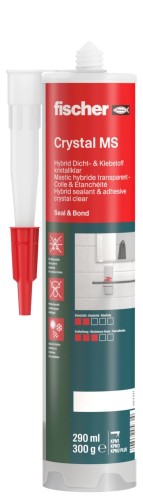 Der fischer Crystal MS mit seinen transparenten Rohstoffen eignet sich perfekt für dauerelastische Abdichtungen und Verklebungen im sichtbaren Bereich, speziell von transparenten Materialien wie Glas. Isolationsmaterial, Leisten, Paneele und Verkleidungen können sicher abgedichtet und geklebt werden. Durch die hohe Anfangshaftung kann in den meisten Fällen auf eine Vorfixierung verzichtet werden. Durch seine spannungsausgleichende Eigenschaft kann er im Außenbereich selbst auf Naturstein und feuchten Untergründen angewendet werden.
