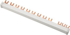 Gabelkammschiene 3 polig zum Anschliessen von 1 FI- Schalter IDP 4 polig, 4 Teilungseinheiten mit 8 Leitungsschutzschaltern 1 polig bzw. entsprechend Leitungsschutzschaltern 3 polig. Einschliesslich Endkappen. Der FI-Schutzschalter muss links montiert werden.