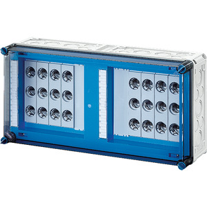 Gehäuse für den Bau von Energie-Schaltgerätekombinationen bis 630 A oder als Einzelgehäuse. Aus hochwertigem Polycarbonat schutzisoliert. Wanddurchführungen mit großen Öffnungen für die elektrische Verbindung der Gehäuse untereinander. Kabeleinführung an allen Gehäusewänden über metrische Vorprägungen oder Anbauflansche. Gehäuse zur Wandbefestigung auch über Außenlaschen oder mit Montageschienen. Gehäuse mit Sicherungselementen für DII-Sicherungseinsätze, E 27, auf Sammelschienen. Mit Zuleitungsklemmen, PE- und N-Klemmen und Berührungsschutz. Deckelverschlüsse für Handbetätigung.