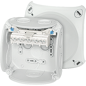 Kabelabzweigkasten aus hochwertigem Thermoplast. Für Aufputz-Anwendungen in Gebäuden oder die geschützte Installation im Freien. Mit Außenlaschen zur Befestigung und Deckelbefestigung über Schnellverschlüsse. Mit innovativer Klemmentechnik bis 4 mm², 5-polig. Kabeleinführung über elastische Dichtmembranen in Gehäusewänden und Boden. Nachträglicher Einsatz von Kabelstutzen durch Entfernen der Dichtmembrane möglich. Mit Deckelhalteband.