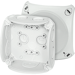 Kabelabzweigkasten aus hochwertigem Thermoplast. Für Aufputz-Anwendungen in Gebäuden oder die geschützte Installation im Freien. Mit Außenlaschen zur Befestigung und Deckelbefestigung über Schnellverschlüsse. Kabelabzweigkasten ohne Klemmen. Kabeleinführung über elastische Dichtmembranen in Gehäusewänden und Boden. Nachträglicher Einsatz von Kabelstutzen durch Entfernen der Dichtmembrane möglich. Mit Deckelhalteband.