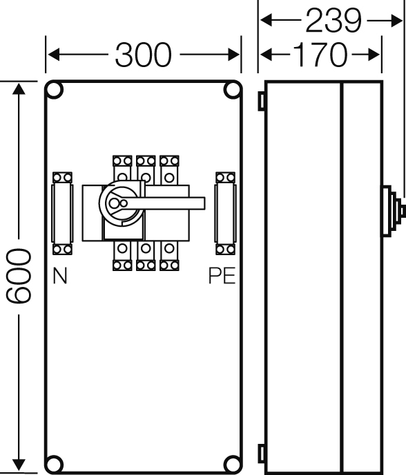 Gehäuse für den Bau von Energie-Schaltgerätekombinationen bis 630 A oder als Einzelgehäuse. Aus hochwertigem Polycarbonat schutzisoliert. Wanddurchführungen mit großen Öffnungen für die elektrische Verbindung der Gehäuse untereinander. Kabeleinführung an allen Gehäusewänden über metrische Vorprägungen oder Anbauflansche. Gehäuse zur Wandbefestigung auch über Außenlaschen oder mit Montageschienen. Gehäuse mit Lasttrennschalter 160 A, 3-polig, nach IEC 60947-3. Mit PE- und N-Klemmen für Kupferleiter. Griff des Lasttrennschalters abschließbar. Deckelverschlüsse für Werkzeugbetätigung.
