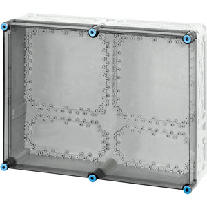 Gehäuse für den Bau von Energie-Schaltgerätekombinationen bis 630 A oder als Einzelgehäuse. Aus hochwertigem Polycarbonat schutzisoliert. Wanddurchführungen mit großen Öffnungen für die elektrische Verbindung der Gehäuse untereinander. Kabeleinführung an allen Gehäusewänden über metrische Vorprägungen oder Anbauflansche. Gehäuse zur Wandbefestigung auch über Außenlaschen oder mit Montageschienen. Leergehäuse mit transparentem Deckel. Einbaumaße B 575 x H 425 x T 150 mm für den Einbau von Geräten auf Montageplatte oder DIN-Tragschiene. Max. Einbautiefe bei eingebauter Montageplatte 146 mm, bei eingebauter Tragschiene 135 mm. Deckelverschlüsse mit Werkzeugbetätigung.