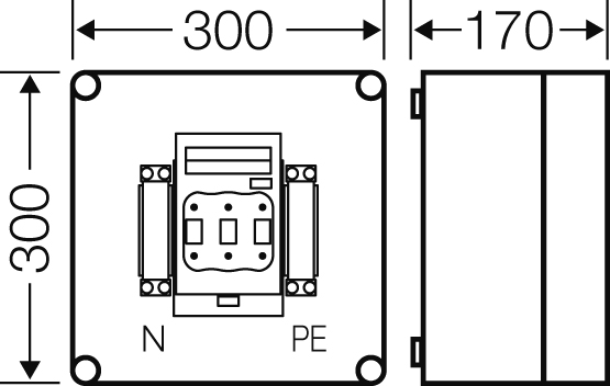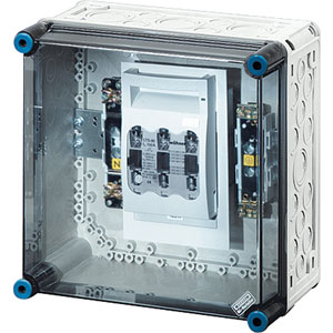 Gehäuse für den Bau von Energie-Schaltgerätekombinationen bis 630 A oder als Einzelgehäuse. Aus hochwertigem Polycarbonat schutzisoliert. Wanddurchführungen mit großen Öffnungen für die elektrische Verbindung der Gehäuse untereinander. Kabeleinführung an allen Gehäusewänden über metrische Vorprägungen oder Anbauflansche. Gehäuse zur Wandbefestigung auch über Außenlaschen oder mit Montageschienen. Gehäuse mit Sicherungslasttrennschalter NH 00, 3-polig, nach IEC 60947-3 auf Montageplatte. Mit PE- und N-Klemmen für Kupferleiter. Deckelverschlüsse für Werkzeugbetätigung.