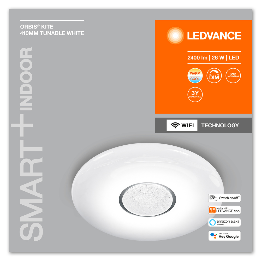 Dekorative Deckenleuchten mit WiFi-Technologie. Produkteigenschaften: Steuerbar über LEDVANCE SMART+ WiFi App (mit mindestens Androidâ¢ï¸ 4.4 oder iOS 9.0). Steuerung über Google Assistant oder Amazon Alexa möglich. Farbtemperatur über Tunable White einstellbar: 3.000...6.500 K. Dimmbar. Netzwerkprotokoll: WiFi. Produktvorteile: Einfache und schnelle Installation. Anwendungsgebiete: Innenraumanwendungen. Küche, Wohn-, Kinder- oder Arbeitszimmer. Technische Ausstattung: Tragbügel enthalten. Inklusive Montageschrauben und Dübel. Steuerung über App oder Sprachsteuerung erfordert kompatibles Smart-Home-System. Für die Steuerung über LEDVANCE SMART + WiFi App ist ein Smartphone oder Tablet erforderlich