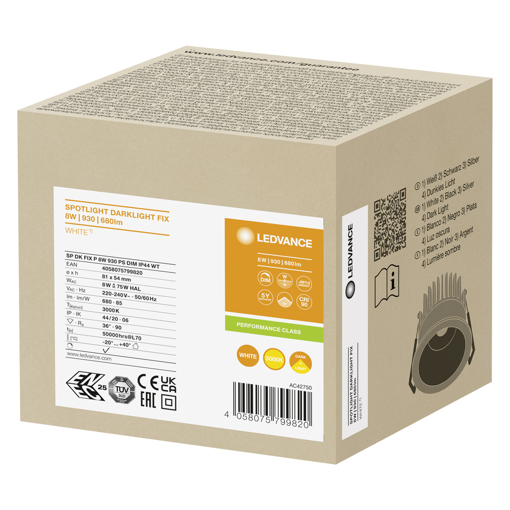 Ledvance LED-Einbaustrahler SPOT DARKLIGHT 8W 930 PS DIM IP44 WT - 4058075799820