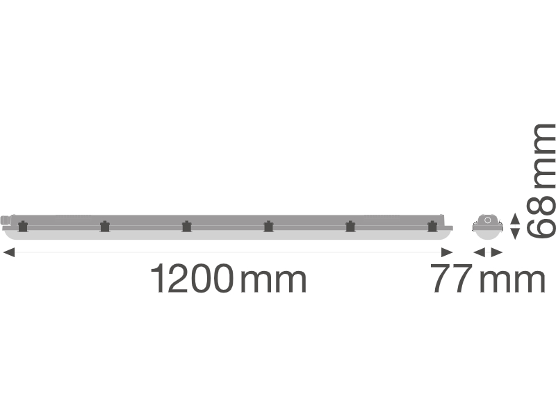 Feuchtraumleuchten, klassische Form. Produkteigenschaften: Hohe Lichtausbeute: bis zu 120 lm/W. Schutzart: IP65. Ausstrahlungswinkel: 115°. Durchverdrahtung möglich. Gehäuse aus Polycarbonat. Produktvorteile: Gleichmäßige Lichtverteilung. Bis zu 50 % Energieersparnis (verglichen mit Leuchten, die Leuchtstofflampen verwenden). Einfache Installation, werkzeugloser Anschluss. 3 Jahre Garantie. Anwendungsgebiete: Industrie- und Lagerareale. Parkplätze und Unterführungen. Garagen. Werkstätten, Fertigungsstraßen. Technische Ausstattung: Klammern aus Edelstahl und Sicherheitsschrauben enthalten. Montagezubehör enthalten (Abhängungs-Kit, Diebstahlschutz-Kit)