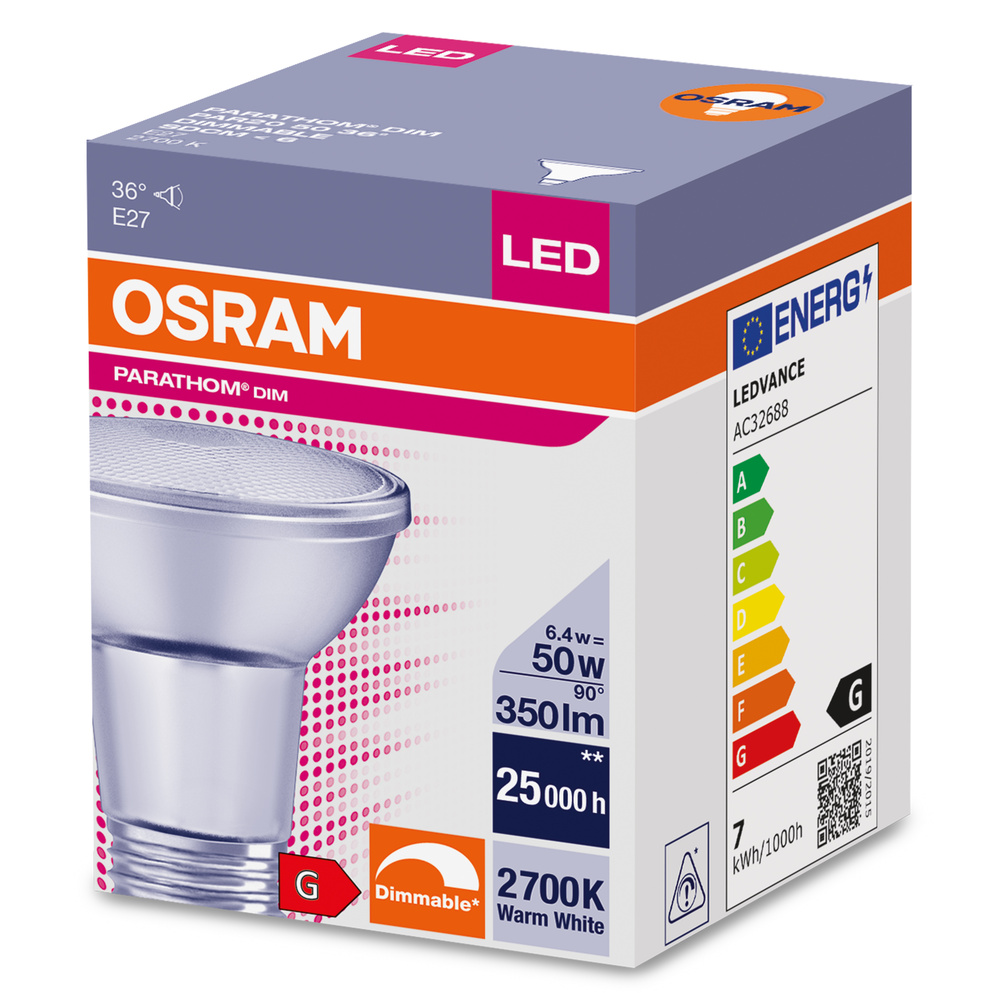 Dimmbare LED-Reflektorlampen PAR20 mit Retrofit-Schraubsockel. Produkteigenschaften: LED-Alternative zu Hochvolthalogenlampen. Hohe Farbkonsistenz: ≤ 6 SDCM (Schwellwerteinheit). Dimmbar. Sockel: E27. Lampe aus Glas. Sehr hohe Farbwiedergabe (Ra: 90). Lebensdauer: bis zu 25.000 h. Produktvorteile: Einfacher, schneller und sicherer Lampenaustausch ohne Umverdrahtung. Design, Abmessungen, Lichtstrom vergleichbar mit einer Glüh- oder Halogenlampe. Geringer Wartungsaufwand durch lange Lebensdauer. Keine UV- und IR-nahen Anteile im Lichtstrahl. Stufenloses Dimmen. Sehr hohe Dimmerkompatibilität, siehe auch www.ledvance.de/dim . Sofort 100 % Licht, keine Aufwärmzeit. Anwendungsgebiete: Verkaufs- und Ausstellungsräume. Anwendungen im Haushalt. Anwendung im Gewerbe. Akzentbeleuchtung. Einsatz im Außenbereich nur in Außenleuchten (mindestens IP65).