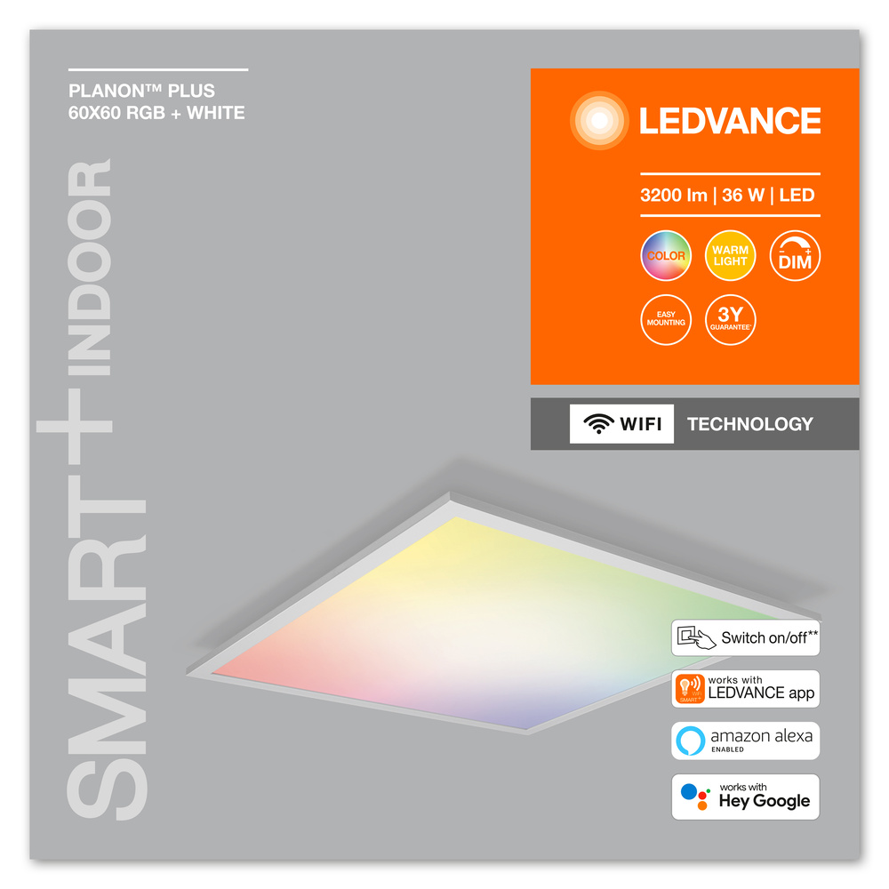 Panelleuchten mit mit WiFi-Technologie. Produkteigenschaften: Steuerbar über LEDVANCE SMART+ WiFi App (mit mindestens Androidâ¢ï¸ 4.4 oder iOS 9.0). Steuerung über Google Assistant oder Amazon Alexa möglich. RGB-Farbsteuerung, ca. 16 Mio. Farbmöglichkeiten einstellbar. Dimmbar. Farbtemperatur: 3.000 K (Warm White). Netzwerkprotokoll: WiFi. Produktvorteile: Einfache und schnelle Installation. Anwendungsgebiete: Innenraumanwendungen. Küche, Wohn-, Kinder- oder Arbeitszimmer. Technische Ausstattung: Tragbügel enthalten. Inklusive Montageschrauben und Dübel. Steuerung über App oder Sprachsteuerung erfordert kompatibles Smart-Home-System. Für die Steuerung über LEDVANCE SMART + WiFi App ist ein Smartphone oder Tablet erforderlich