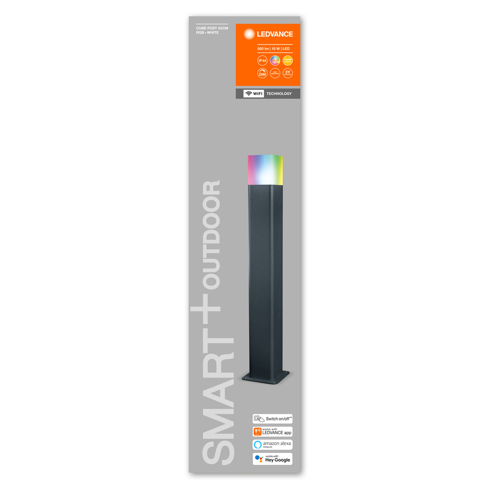 Leuchten mit WiFi-Technologie. Produkteigenschaften: Steuerbar über LEDVANCE SMART+ WiFi App (mit mindestens Androidâ¢ï¸ 4.4 oder iOS 9.0). Steuerung über Google Assistant oder Amazon Alexa möglich. RGB-Farbsteuerung, ca. 16 Mio. Farbmöglichkeiten einstellbar. Dimmbar. Farbtemperatur: 3.000 K (Warm White). Netzwerkprotokoll: WiFi. Schutzart: IP44. Produktvorteile: Einfache und schnelle Installation. Farbenreiche Gartenbeleuchtung mit smarten Steuerungsmöglichkeiten. Vereint die Funktionalität von Allgemeinbeleuchtung und Stimmungsbeleuchtung. Anwendungsgebiete: Allgemeinbeleuchtung. Gärten. Terrassen, Balkone. Technische Ausstattung: Inklusive Montageschrauben und Dübel. Steuerung über App oder Sprachsteuerung erfordert kompatibles Smart-Home-System. Für die Steuerung über LEDVANCE SMART + WiFi App ist ein Smartphone oder Tablet erforderlich