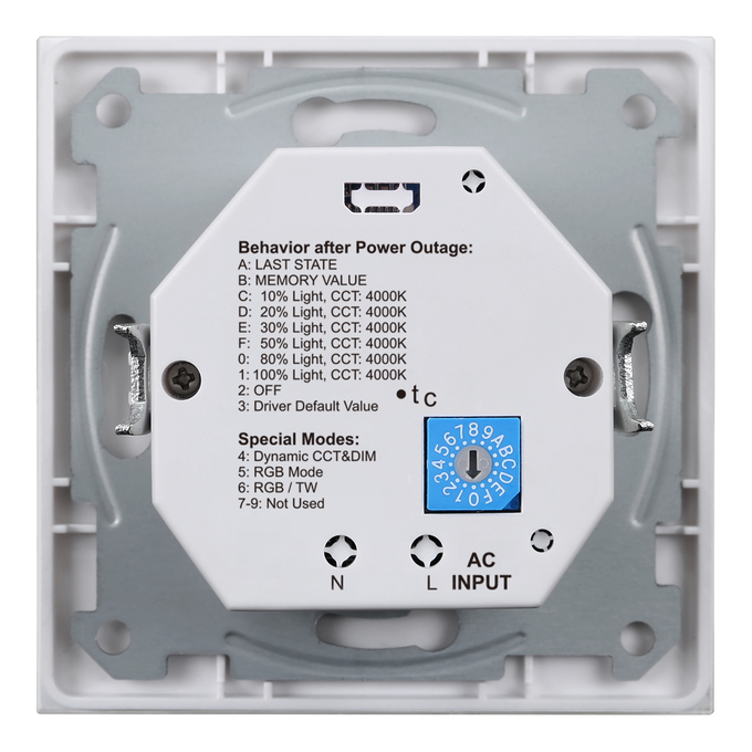 Manuelles Steuergerät für bis zu 40 Lichtprodukte, Tunable White und RGB Lichtfunktion, austauschbare Tasterabdeckung. Produkteigenschaften: Zigbee 3.0 zertifiziertes Steuergerät für die Montage in handelsüblichen Unterputzdosen. Drehknopf für manuelle Lichtsteuerung. Tunable White, RGB, RGB plus TW (Plug & Play Modi), einstellbar am Gerät. Direkte Inbetriebnahme über Bluetooth möglich. Kompatibel mit Zigbee 3.0 Steuerungen. Bis zu 40 Zigbee Lichtpunkte. Produktvorteile: Einfache und intuitive Bedienung. Manuelles Dimmen, Schalten und Speichern von Lichteinstellungen. Kombinierte RGB und TW Steuerungen möglich. Individuelle Einstellung der Helligkeitsstufe und der Farbtemperatur. Austauschbare Frontabdeckung kompatibel mit ABB, GIRA, JUNG, SCHNEIDER, BERKER, SIEMENS. Verhalten nach Netzunterbrechung einstellbar. Wartungsarm durch Netzspannungsbetrieb. Optionaler Rahmen für Aufputzmontage verfügbar. Funktioniert ohne Gateway in Direct Easy oder mit Vivares Zigbee. Anwendungsgebiete: Meeting- und Konferenzräume. Restaurants. Shopbeleuchtung. Private Wohnbereiche. Technische Ausstattung: Aufputzrahmen zur Wandmontage ohne Unterputzdose. Sicherheitshinweise: Alle elektrischen Anschlüsse dürfen nur von qualifiziertem Fachpersonal ausgeführt werden.. Vorsicht, Gefahr des elektrischen Schlages..