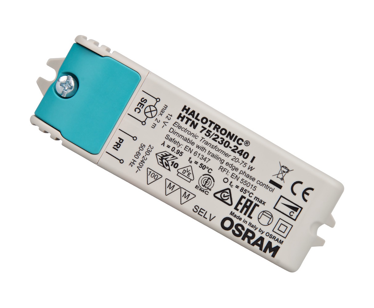Elektronische Trafos für Halogen-Niedervolt-Lampen. Produkteigenschaften: Netzfrequenz: 50...60 Hz. Funkentstörung: nach EN 55015 (A1: 2007)/CISPR 15, EN 55022. Netzstromoberwellen nach EN 61000-3-2. Immunität, Störfestigkeit nach EN 61547. Sicherheit: nach EN 61347. Kurzschlussschutz, Überlastschutz, Übertemperaturschutz: elektronisch reversibel. Galvanische Trennung zwischen Primär- und Sekundärseite. Sekundärseitiges Schalten zwischen elektronischem Trafo und Lampe nicht zulässig. Energieeffizienz: ≥ 91 % (gemäß ErP-Verordnung 2012/1194/EC). Dimmbar über Phasenanschnitt (ohne HTN)und Phasenabschnitt. Produktvorteile: Sehr geringe Verlustleistung durch hohe Effizienz. Zugentlastung für unterschiedliche Kabeltypen geeignet (HTM). Geeignet für platzkritischen Einbau durch kompaktes funktionelles Design. Extrem kompakter Transformator für sehr platzkritische Einbaubedingungen (HTN). Lampenschonender Betrieb im gesamten Teillastbereich für lange Lampenlebensdauer. Anwendungsgebiete: Effekt- und Akzentbeleuchtung. Wohnzimmer. Objektbeleuchtung. Konferenzräume. Restaurants. Möbeleinbau- und Möbelaufbauleuchten. Shopbeleuchtung. Veranstaltungsräume.