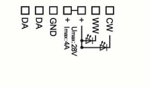 Der Lunatone DALI CW-WW LED Dimmer CV hat eine umschaltbare PWM-Frequenz (122Hz/244Hz/488Hz/976Hz) und eine Versorgungsspannung von 12V bis 48V DC. Der maximale Anschlussstrom von 4 A kann beliebig auf die Kanäle verteilt werden.